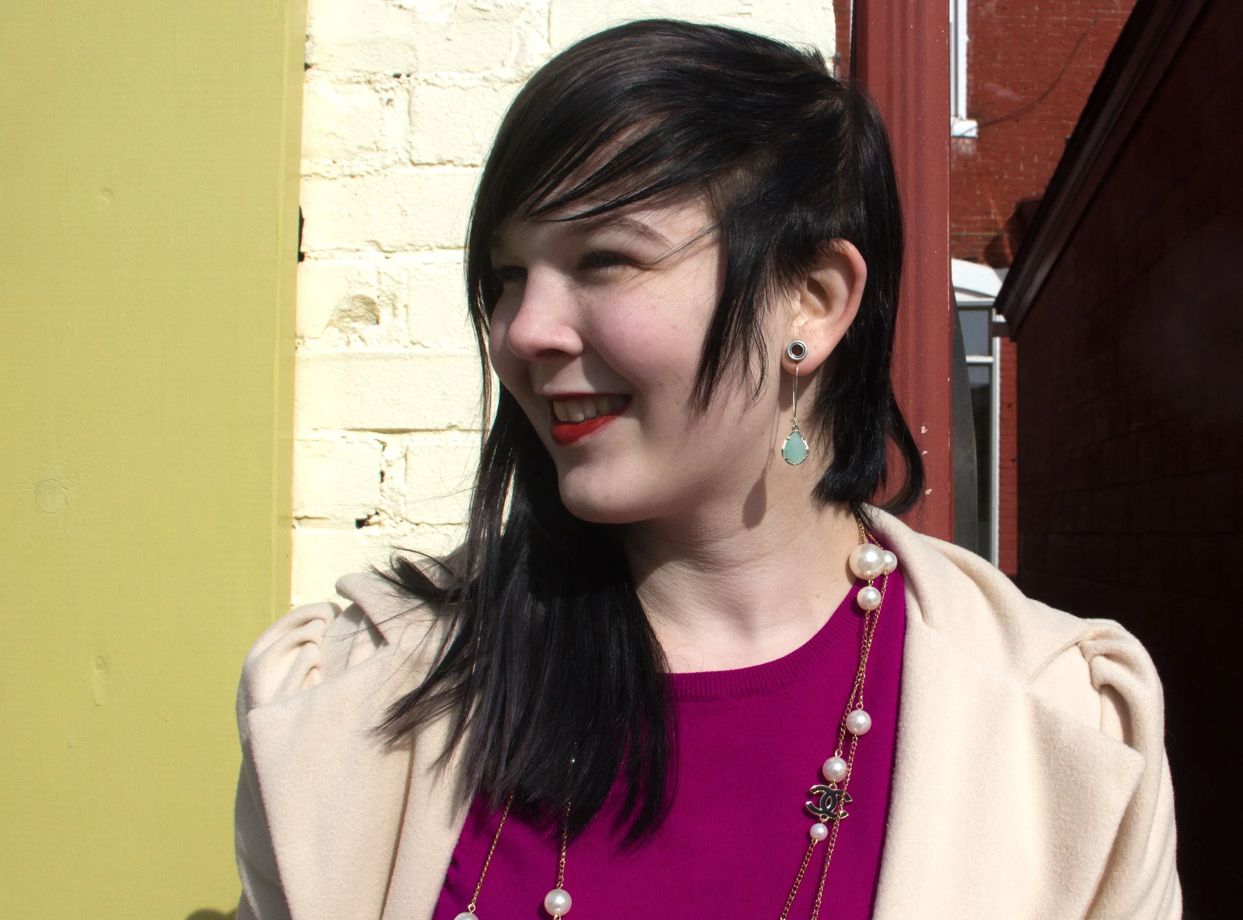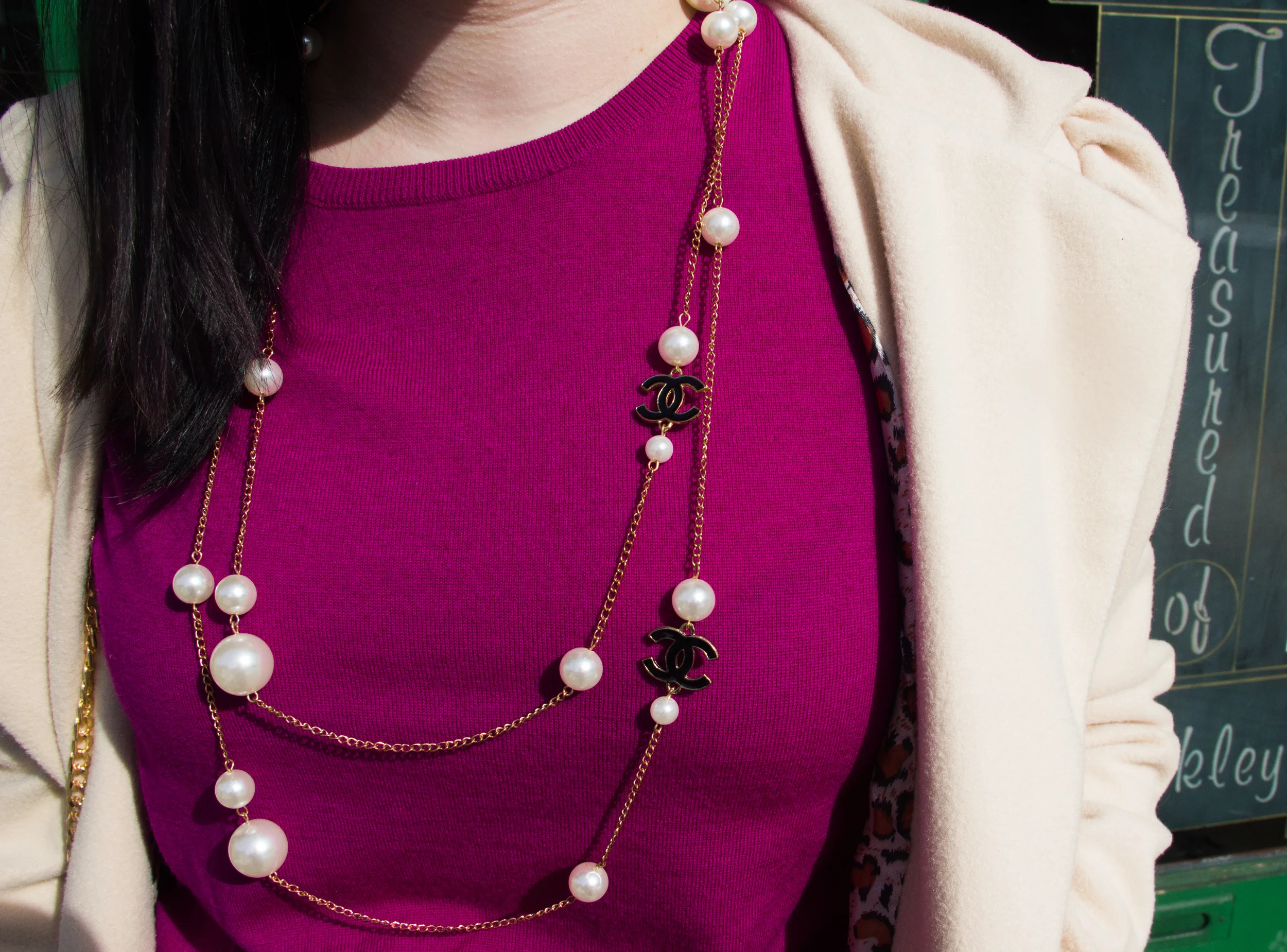 Next up is my light burgundy cashmere sweater. I chose this piece because I just love the richness of the color and the pop that it gave my otherwise neutral outfits. It also pairs nicely with my Chanel layered pearl necklace and favorite grey Levi skinnies.